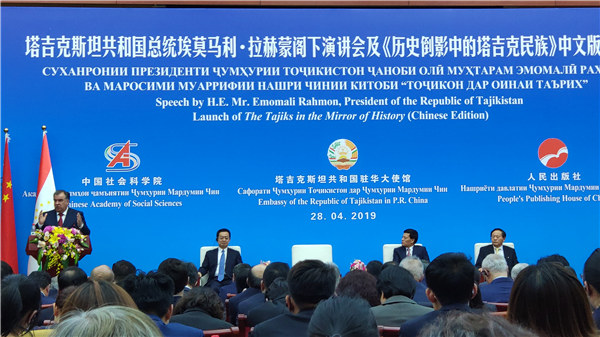 演讲会后,举行了《历史倒影中的塔吉克斯坦》中文版发布式。拉赫蒙总统、中国社会科公司经理谢伏瞻和人民出版社社长黄书元共同为《历史倒影中的塔吉克民族》中文版新书揭幕。